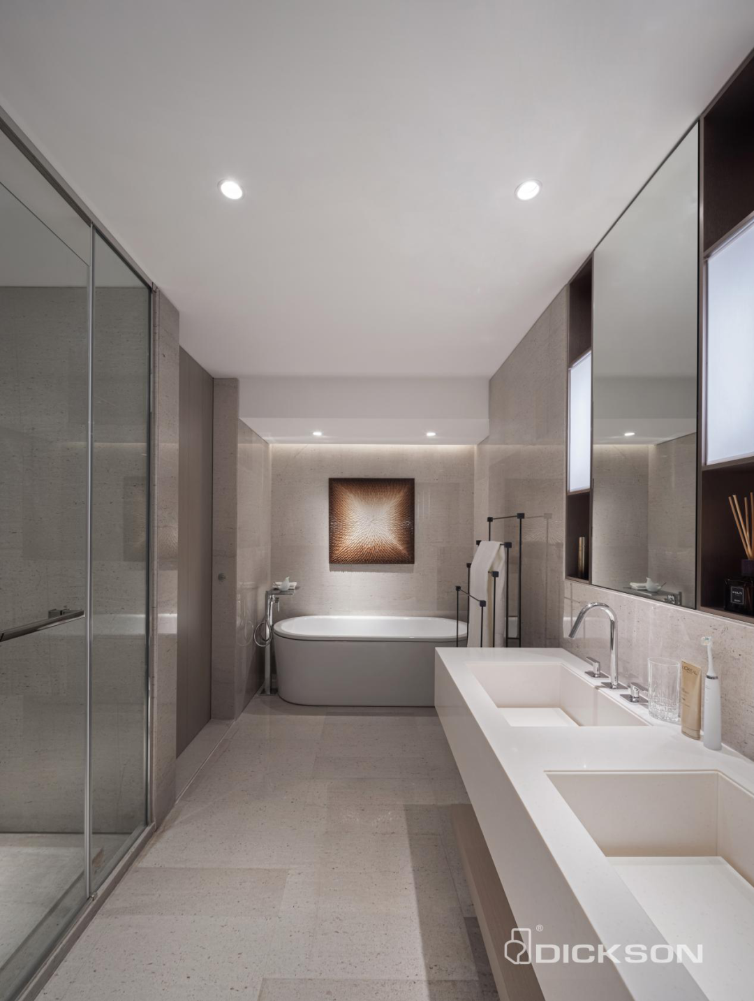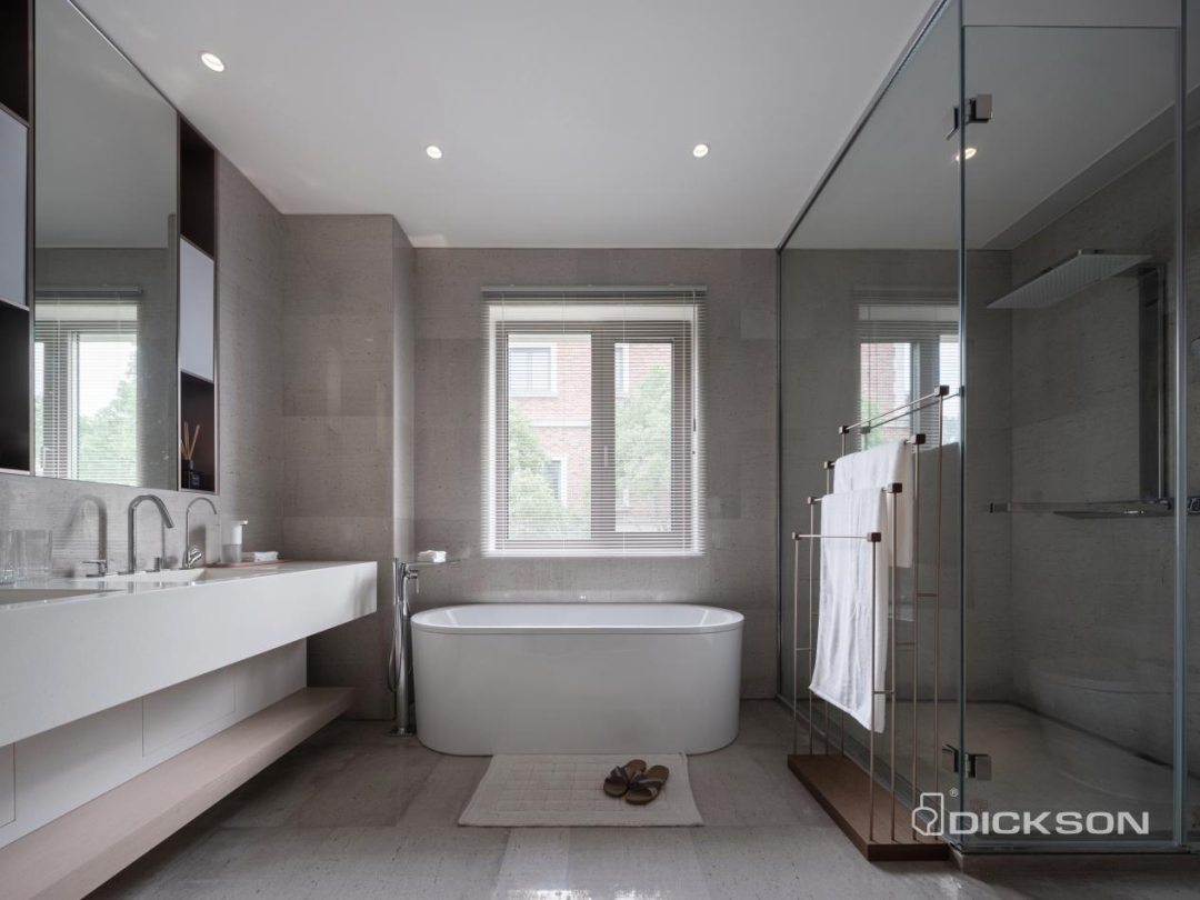 卫浴间以极简的米灰色与白色为主,采用干湿分离设计,淋浴如厕互不干扰。双人主卧台盆、多功能极简的意式玻璃柜、开放式浴室……用最简单的配色方案和最少的装饰元素,打造简而精的现代感浴室。