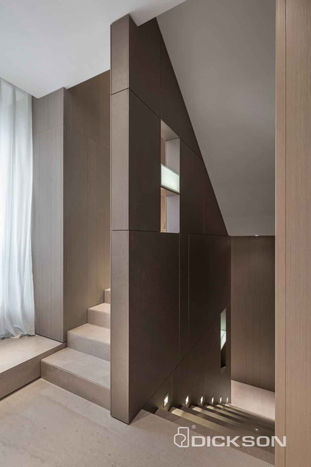 楼梯和护墙板完美结合,占用的空间面积极少,还能防火、防潮、防污,与木门、趟门、皮硬包设计风格融合,功能性与艺术性兼备,将空间的气质与品位无限升华。