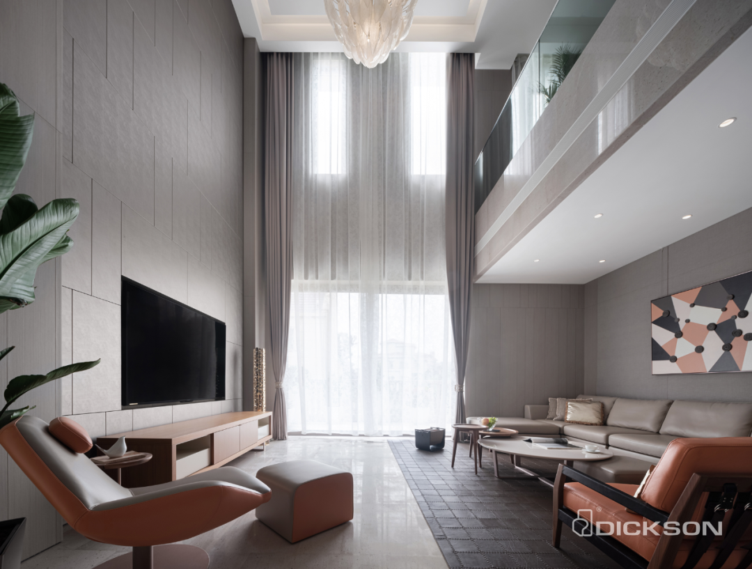 本案中客厅整体色调以米灰色为主,构成均匀干净的基底,局部点缀绚丽却不张扬的橙色,让人眼前一亮,呈现不与流俗的惊艳优雅观感。