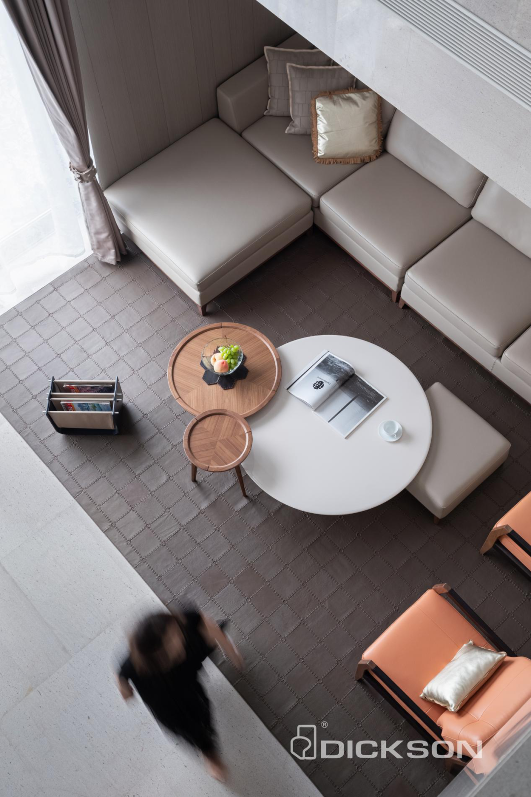 原有宽阔且无隔的格局,以一道深灰格子皮革地毯牵引空间层层递进,使现代简约氛围饱含精细细节;与沙发、躺椅相呼应的几何装饰画,既能延伸空间的视觉感,也让空间立体感更加明显。