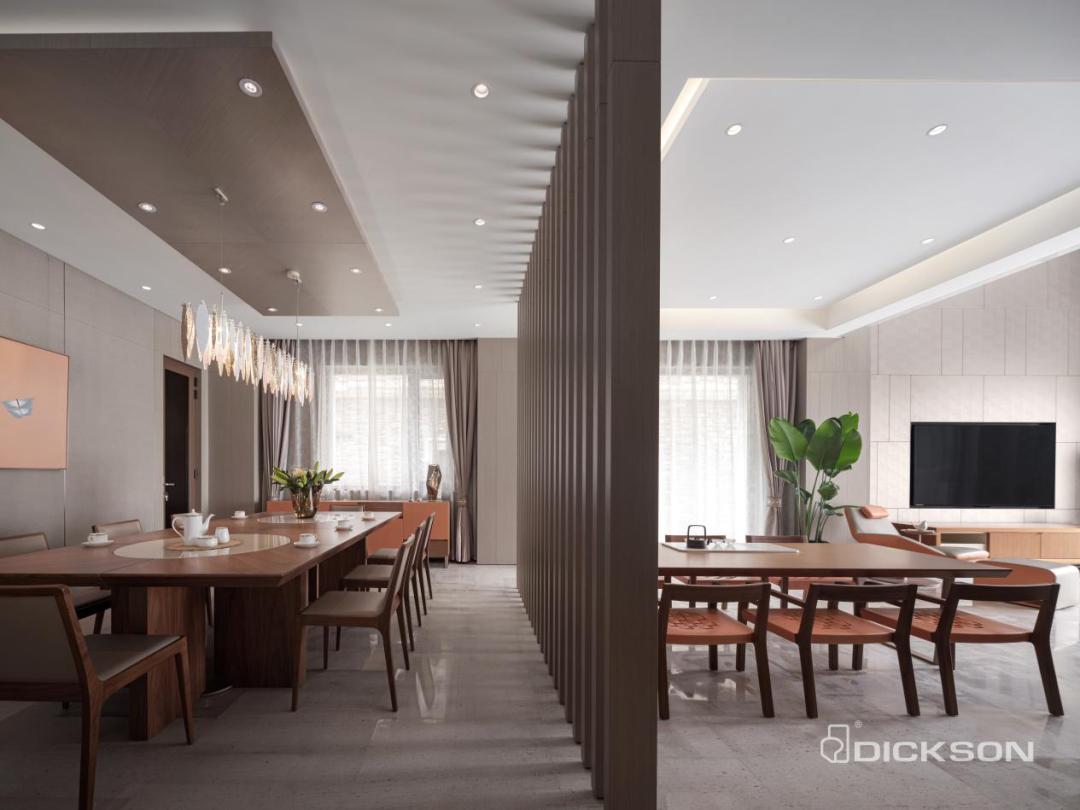 餐厅与茶桌比邻,中间用镂空的木质屏风做为隔断,隔而不断,通透大气,让整个空间更为明亮开阔。
