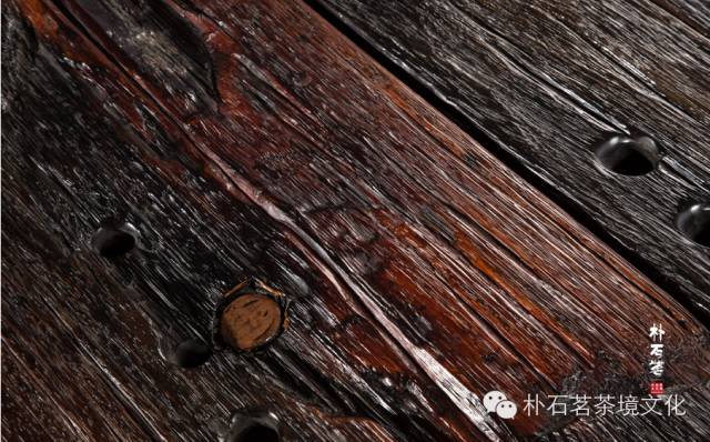 船钉经过海水长期浸泡发生氧化反应后,形成的锈斑就会不断渗透到木材中,日积月累后就形成自然而又美丽的黑色纹理。起伏的纹理是被海水侵蚀的痕迹,而那些大小不一的钻孔则是船钉留下的永恒印迹。这些特殊的天然印迹让船木家具具有其它家具很难比拟的粗犷气质以及强烈的艺术感。