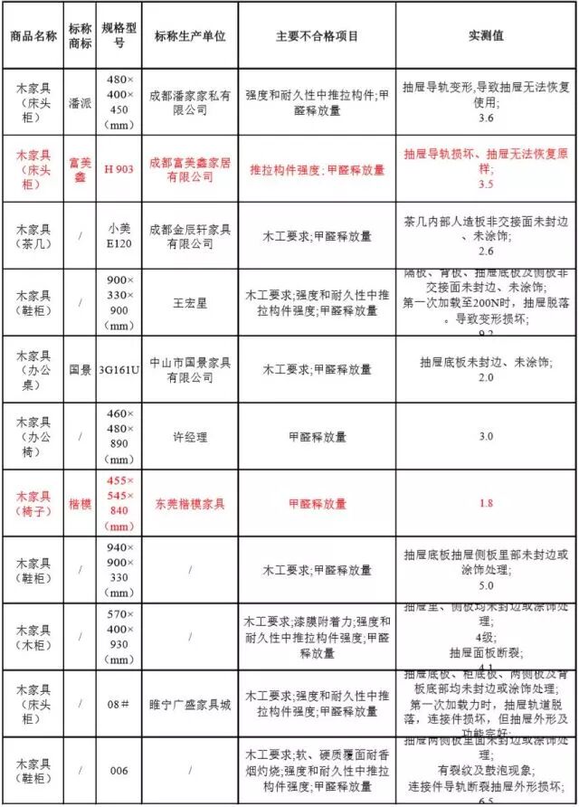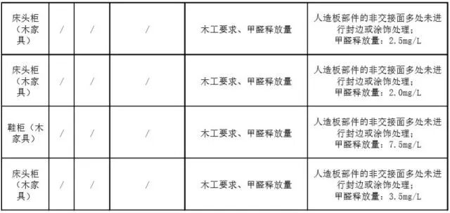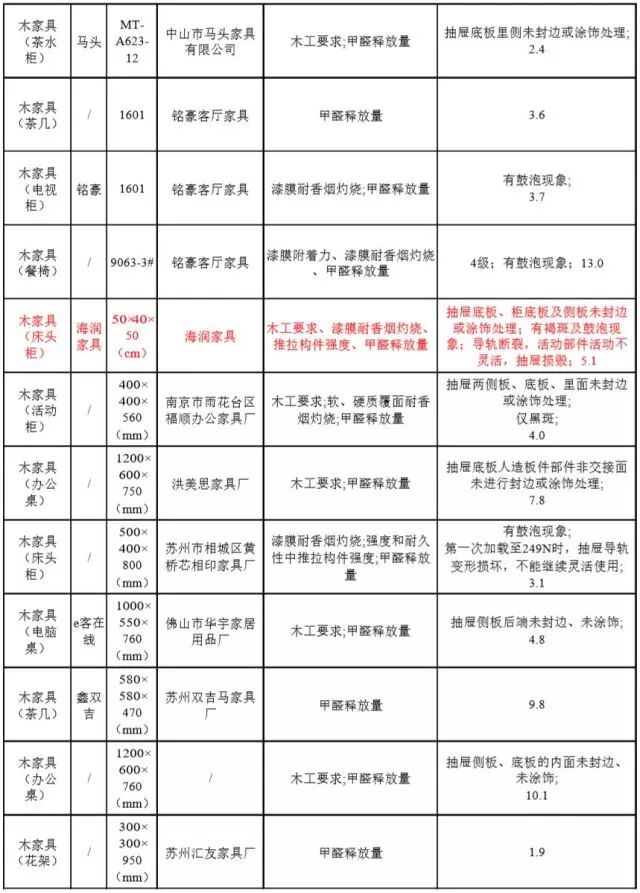 此外,还有的家具出现“外观要求”、“表面理化性能要求”、“力学性能要求”不合格的情况。