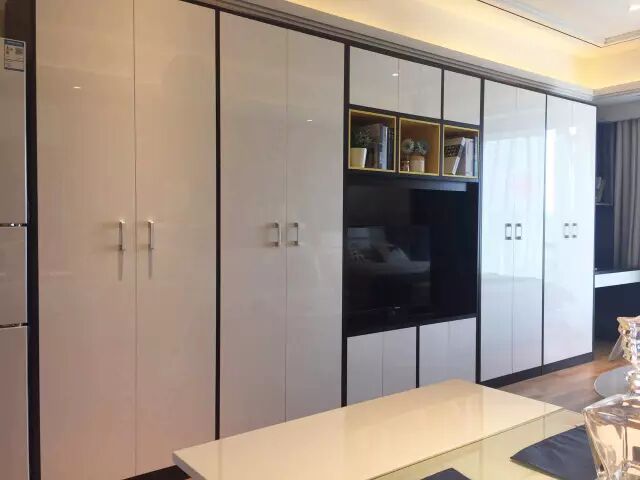 从入口处起,丰富的柜体空间尽显眼前,可以将屋主的衣物、杂物得到摆放;设计师选用的家具尺度都比较小,并将所有的功能区都贴边摆放,留下过道区域,将公寓中唯一的光源得到很好的延伸,也带来洁净的视觉效果。