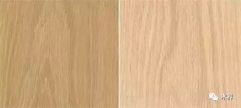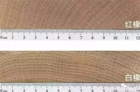 红橡木的边材一般是白色的或者是浅棕色,它的心材是粉红棕色。白橡木的边材是浅色,心材是浅棕色到深褐色过渡的颜色。如果是没有相关经验的人,想要只通过颜色就可以辨别出红橡和白橡的区别是有一些困难的。想要分辨需要通过放大镜观察年轮,如下图所示。