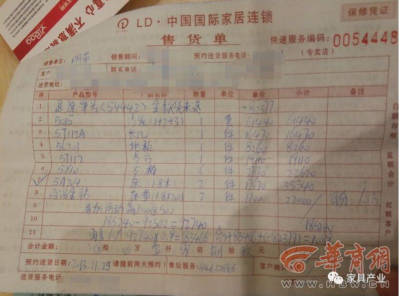 2013年10月,陈先生购买了一套橡木家具,“我在北二环明珠家具城的新南天家具购买的家具,当时宣传的是全套家具的材质是百分百橡木和真皮,沙发、餐桌、餐椅等全套家具,打折后一共13万多。”