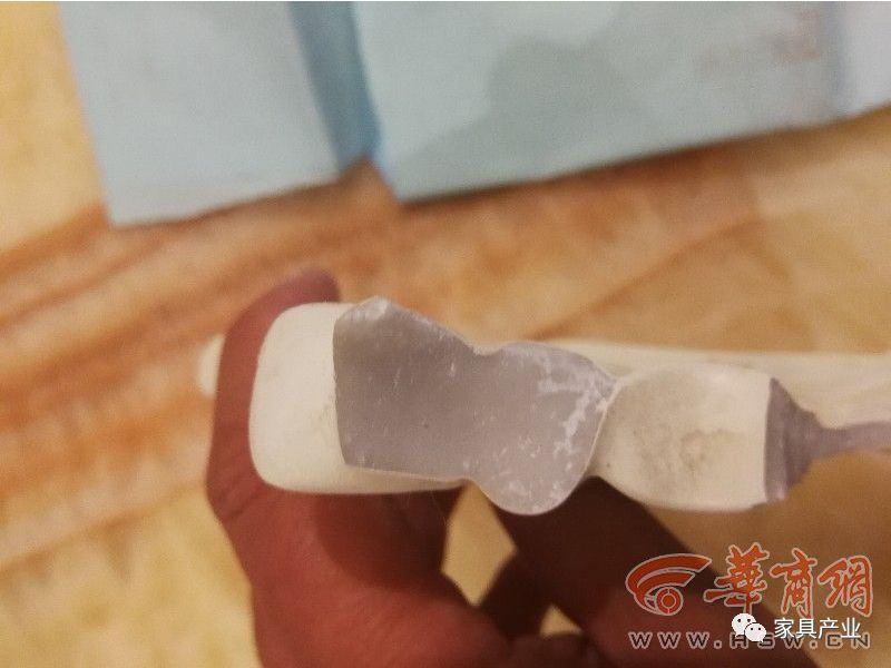陈先生看到椅背断裂处觉得奇怪,“断裂处颜色呈半透明乳白状,不像橡木,像复合石。”陈先生随后马上联系售后。