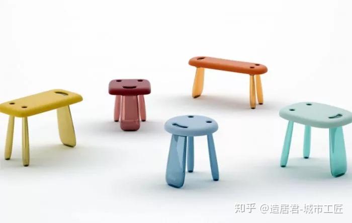 Nendo 的创始人 Oki Sato 基于人的笑脸设计了这些彩色的凳子,两只眼睛和微笑着的嘴巴下面连接了塑料的腿,四周是温润的触感。