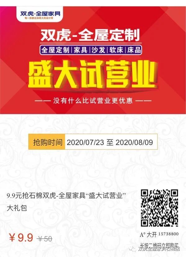 识别图中二维码9.9元抢购双虎全屋家具盛大试营业大礼包!
