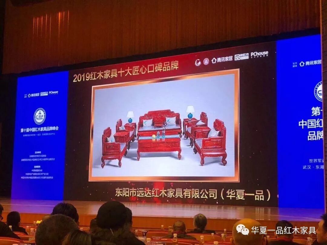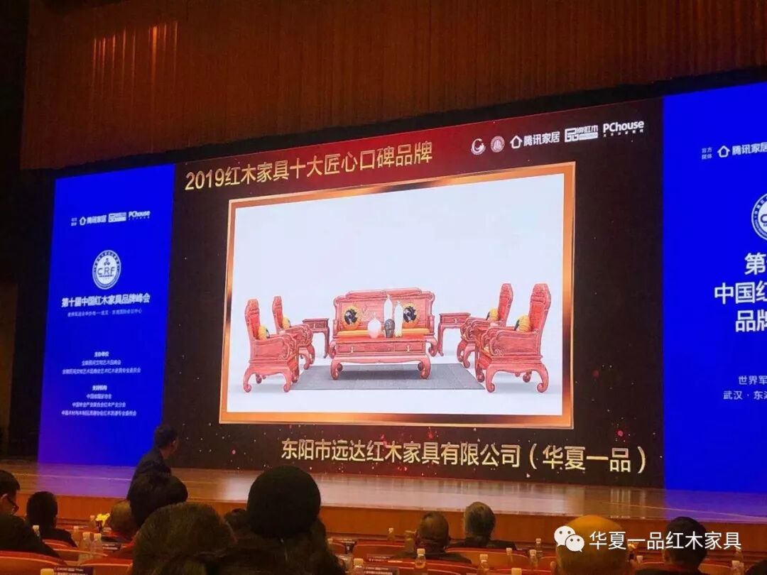“二十三年,诚信为标、品质为守,经典无数;十载光阴,传承为基、创新为核心光彩无限。缅甸花梨、绒毛黄檀、红木整装,悠悠华夏,且看它挥斥方遒。”这是第十届中国红木家具品牌峰会组委会授予东阳市远达红木家具有限公司(以下简称华夏一品)“2019红木家具十大匠心口碑品牌”的颁奖词。