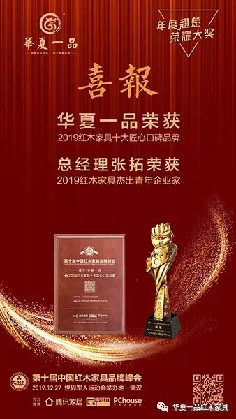 聚力突围、筑梦前行。12月27日,在世界军人运动会举办地武汉,由全联民间文物艺术品商会、全联民间文物艺术品商会艺术红木家具专业委员会主办,得到腾讯家居、《品牌红木》全媒体、太平洋家居作为官方媒体支持的第十届中国红木家具品牌峰会如期而至。与此同时,2019中国红木家具“红品奖”颁奖盛典同期盛大上演,华夏一品勇夺“2019红木家具十大匠心口碑品牌”,展品牌实力。与此同时,总经理张拓也凭借敢想敢拼、锐意进取、不断求索的精神高票当选“2019红木家具杰出青年企业家”,实至名归。