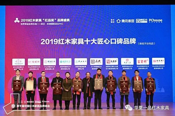 华夏一品(右三)荣获“2019红木家具十大匠心口碑品牌”,可喜可贺