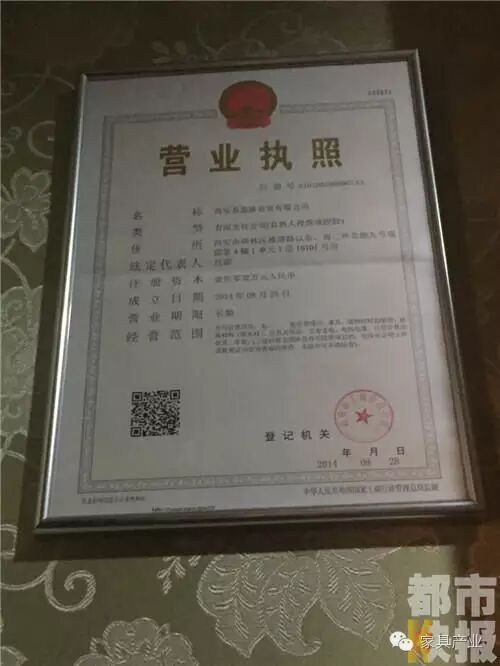 《都市热线》全媒体记者在家具城一楼的前服务台,发现了这种目前和家具城唯一有关系的营业执照,可以看到这家公司注册的名字为西安易盖隆商贸有限公司,注册成立的日期为:2014年8月28日。经营范围为家具、装饰材料等,法定代表人是一个叫做汪澎的人,不过大家告诉我们说,在今天早上出现了这样的情况之后,包括这个法人在内,这里所有的工作人员都已经失去了联系。