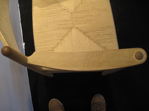 这款椅子舒适感也是非常让我意外,坐上去竟然有点不想下来。无论扶手、靠背、座垫与人体的贴合感都非常和谐。尤其靠背,从第一张图和第三张图结合来看,要扣钉的地方是凹进去的,而实际效果是,腰部和颈部凸起来,非常符合背部曲线。靠背上的耳朵微微朝前卷起,大部分类似的椅子耳朵的地方是比较夸张的,头部靠过去时,脸转向侧面就感觉有些压抑了,而这把椅子处理得很优美。现场时我比较疑惑,我印象中Hans Wegner没有这样比较有机形式的设计,我竟然忽略了这把椅子,回家一查才发现它不是Hans Wegner设计的,作者是Frits Henningsen。