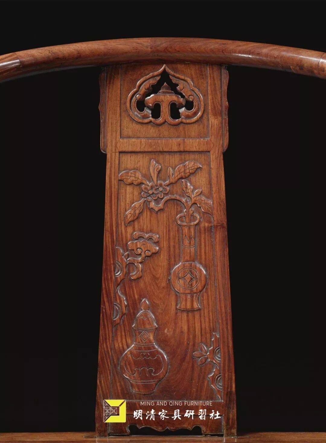 座盘之上,四腿皆为圆形截面,后腿两侧立牙,前腿只是前面单侧有立牙条,镰把棍, 单曲线向外膨出,下粗上细,支撑椅圈。靠背作法特殊,圈椅靠背为独板或打槽装板作法,但此圈椅靠背是两边立柱打槽,中嵌一块独板,下有亮脚,是从独芯板直接做出,上有团花,是先在独板芯上挖出一个如意云头状的孔洞,另雕一与之形状相应的赤虎闹灵芝图案的透雕饰件,从前往后嵌入。因此团花是突出于靠背板面的,装饰效果比一般平面雕刻更有意味。而下面亮脚的纹样与线条的运用也可称精彩之笔。