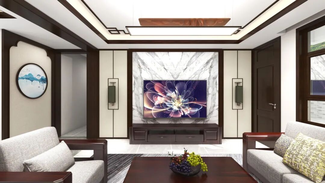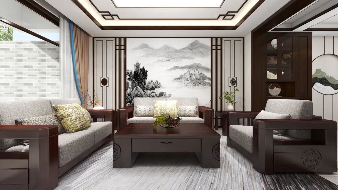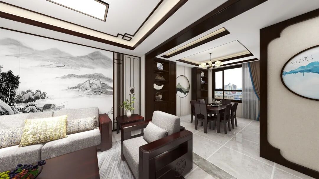 墙面采用中式风格,背景黑灰色山水画、深色条纹格栅与沙发色彩一致,空间协调统一,空间中各类中式条纹元素,彰显中华韵味。