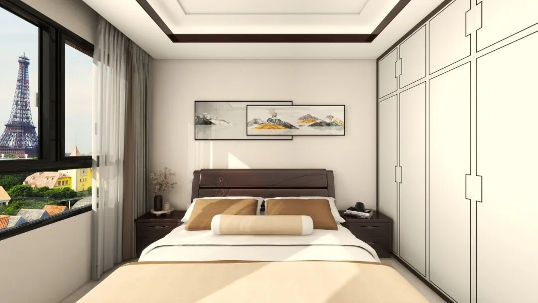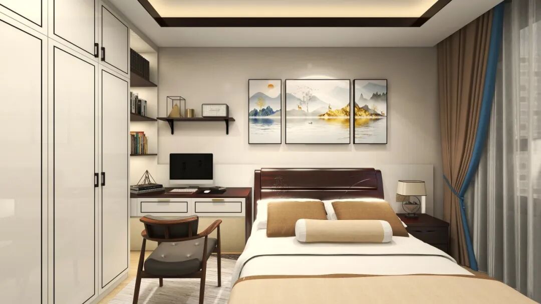 卧室采用楠木实木大床,典雅而高贵。米白色定制衣柜将空间色彩提亮,直线条纹凸显现代,山水挂画与整体中式风格更协调。