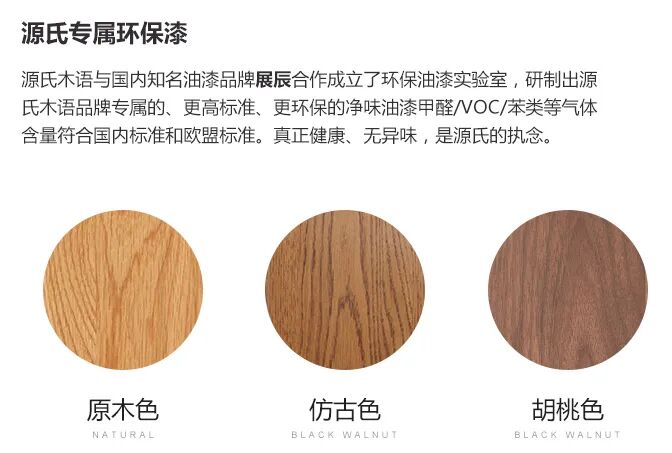 再者就是高环保,源氏木语家具采用自主研发的净味清漆,以及德国osmo天然木蜡油,甲醛、voc、苯类等有害气体含量远低于国标。