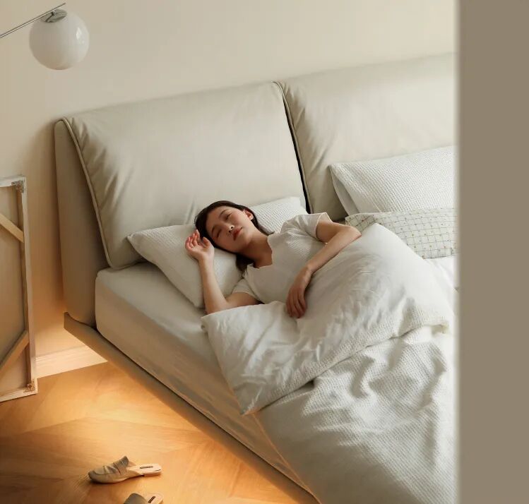 隐藏式内收床腿,看起来悬浮于空中的设计,视觉上清爽美观显空旷。床下还有感应灯,屋内光线不足时,2m范围内有人走动,就会自动亮起暖光,避免磕碰、绊倒。