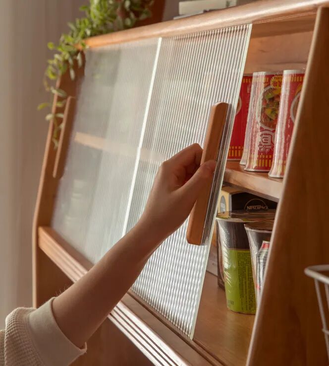 北美FAS级樱桃木打造,2.1m宽的大尺寸餐边柜,有移门玻璃区、开放置物区、抽屉区,中间4cm厚的台面和超大洞洞板,挂的下宜家很多小钩子,剪刀、勺子、茶杯轻松收纳。