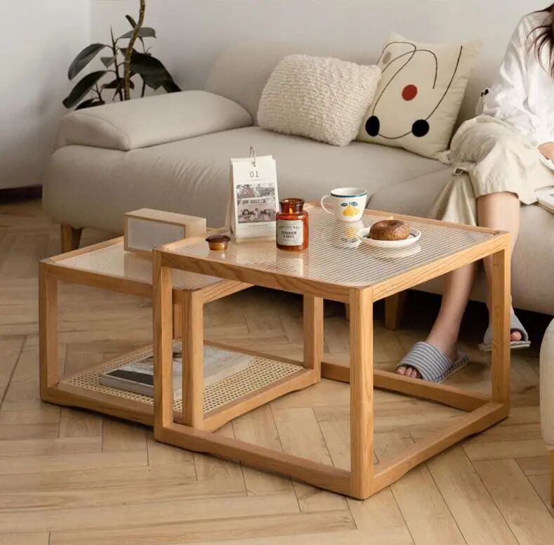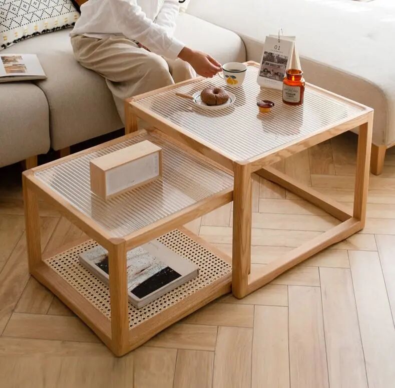 颜值超高的网红方糖茶几,晶莹剔透的长虹玻璃台面,底下是手工编织的藤编网,结实耐用能承重,两个茶几都能单独使用,非常灵活。