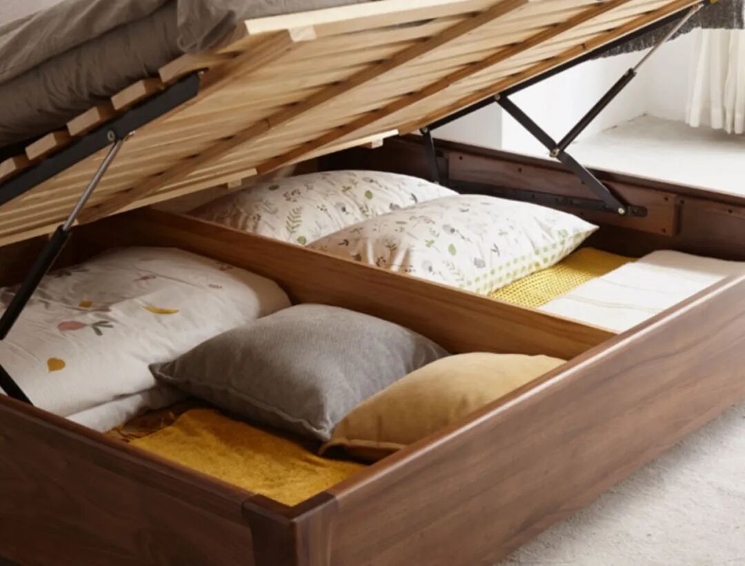 轻奢质感的黑胡桃木箱体床,床下的储物空间非常大,换季的棉被、衣物都可以装得下,相当于多一个隐形衣柜