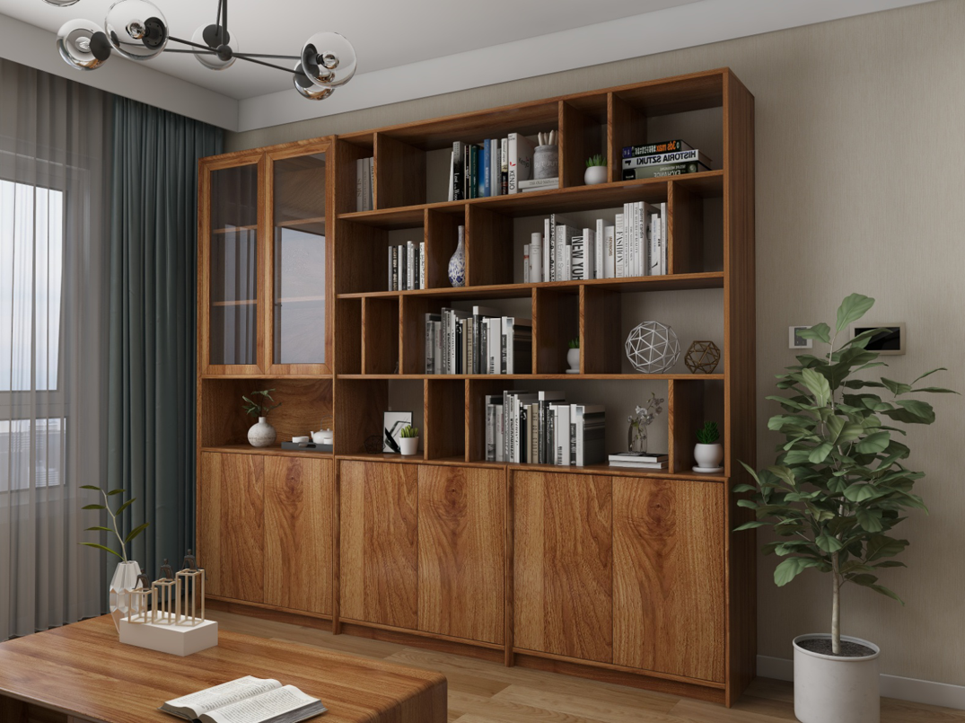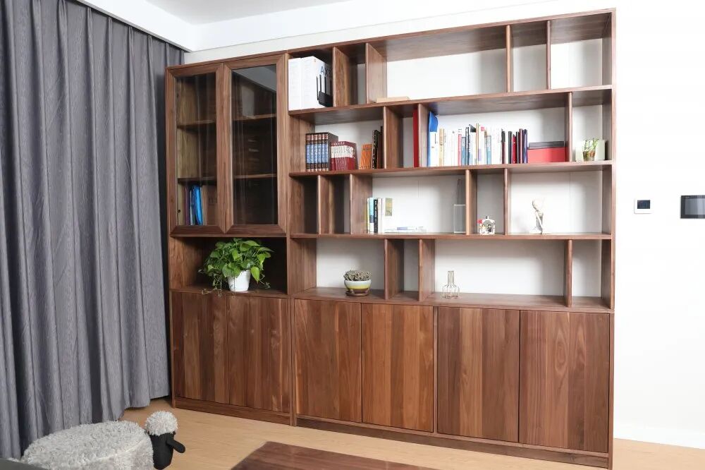 多功能书柜采用了一半玻璃门,一半开放式的设计,在小户型空间里,视觉呈现更通透。下半部分的收纳柜门,又很好地隐藏收纳家中杂物。