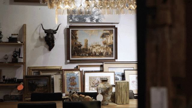 还有一个堆放着装饰画的角落,中古气息满满。作为高性价比的软装单品,随便挑一幅挂在家里,氛围立马提升不少。