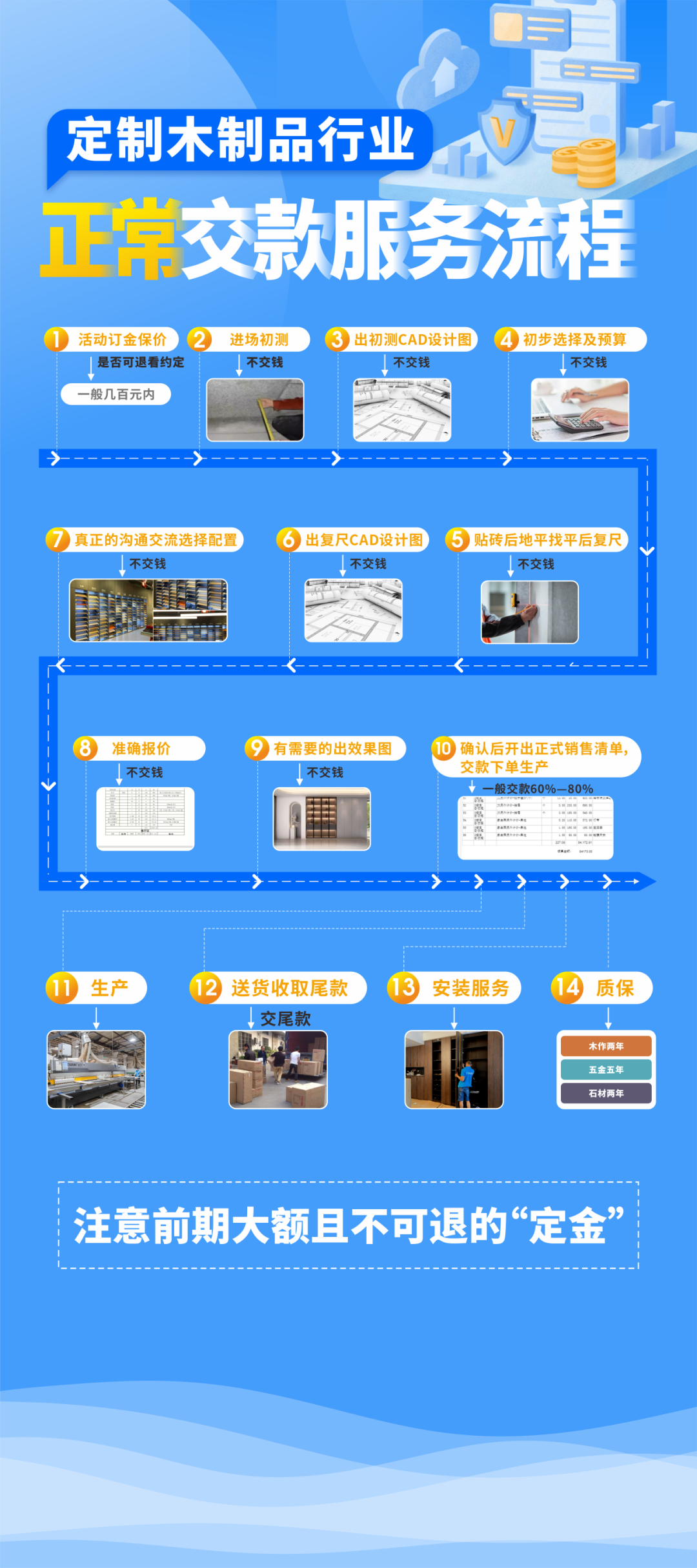 定制产品不是成品,是不需要提前备货的。定制木制品均是在地砖贴完,墙体改造完毕,甚至地平找完,吊顶装完,才会产生第二次测量。在这个时间段,才有准确的设计,才会有准确的尺寸,才会有最后的配置选择。只有这个时间,客户才会正式下单,正式算总价,以前全部属于预算,无论设计多少次出多少图都是预算。只有这个时间点,商家才会向厂家下单开始生产,所以: