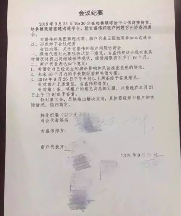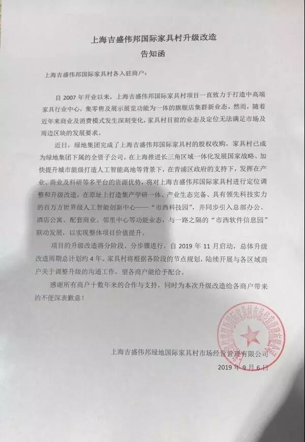 2019年9月16日,入驻商户于收到吉盛伟邦《上海吉盛伟邦国际家具村升级改造告知函》,面临撤店局面。