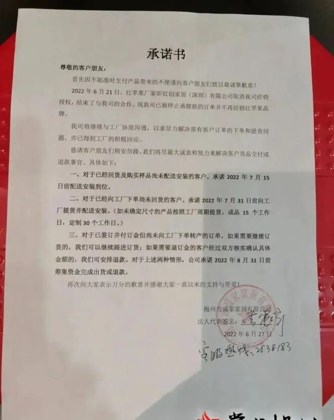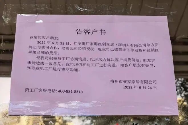 “红苹果”是在梅州经营了二十余年的家具老品牌,由于口碑较好,深得市民信任。然而近日,红苹果家具的梅州经销商(梅州市盛家家居有限公司)多个门店突然被清空撤场,引发近百名客户到店讨说法。经销商负责人到场解释称该公司被厂家终止经销授权,无法经销红苹果品牌家具,并称将尽最大诚意和努力解决客户货品或退款事宜。