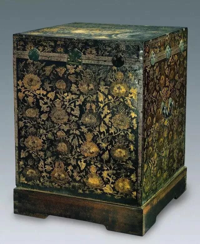 明万历 缠莲八宝纹彩金象描金紫漆大箱