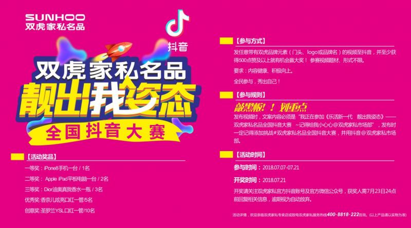 与以往的促销活动不同,品质爆品节将为消费者提供全程高质、高速的物流保障,实现“下单即可收货”的物流体验,同时还有“百万豪礼天天送、12种大奖任你抢”“双虎抖音大赛躺送iPhone8手机”等诸多特别好玩的互动环节,让每一位参与品质爆品节的消费者都能感受到新零售思维下快捷欢乐的购物享受。