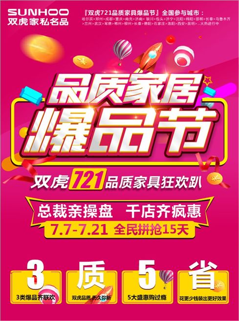 “双虎721品质家居爆品节”由双虎集团总部组织,双虎总裁亲自主导,活动中特意优选了全年最受消费者喜爱的各类畅销家具爆品,给出了前所未有的让利疯惠,还有特别好玩的互动形式,力图让每一位消费者朋友都能获得最满意、最优惠、最时尚新潮的置家购物享受,打造家具狂欢日!