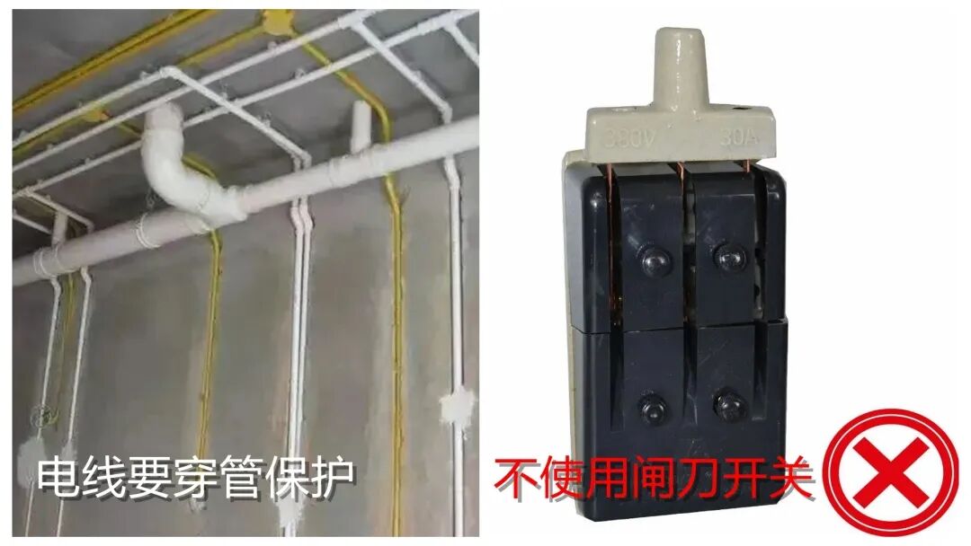 电线要加套阻燃性管保护,定期检查家里的漏电保护装置是否正常工作;选用安全的电气开关,同时电源要安装配电箱。