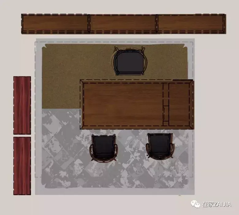 案台一般还会配置一把圈椅和扶手椅,背后配上两、三组三门大书柜,单侧配两个台案,如此搭配下来,没有个5米见方的空间完全有心无力。