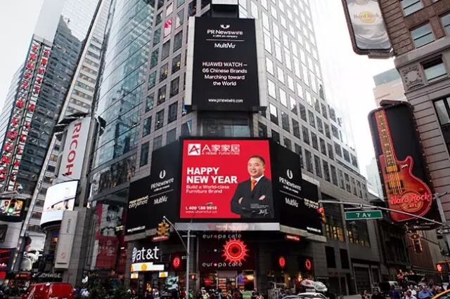 春节,是中国的,也是世界的,意味着团圆、幸福、欢乐!随着海外“中国年”持续升温,纽约时代广场出现越来越多的中国元素。在春节这个中国最隆重的节日里,由A家家居领衔的100个中国品牌在纽约时代广场轮番刷屏贺新春,将进一步增强中国民族品牌的国际话语权、竞争力,成为塑造“中国梦”形象的又一股强力推动力量。