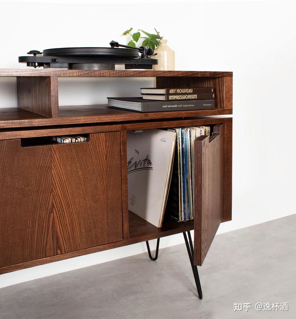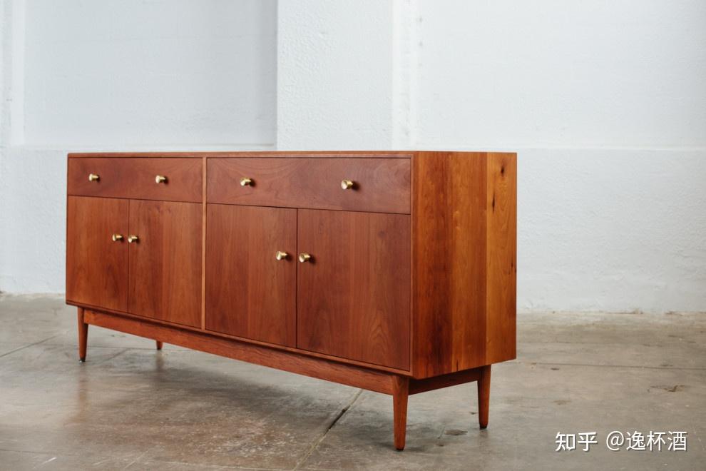 我们看MCM风格的家具,常用柚木皮和樱桃木皮来呈现温暖的蜂蜜色,樱桃木因为有优雅的花纹,柜子的造型就可以更偏简单一点,而柚木材质的就需要多一点条线和小的细节,来丰富整个家具的层次。