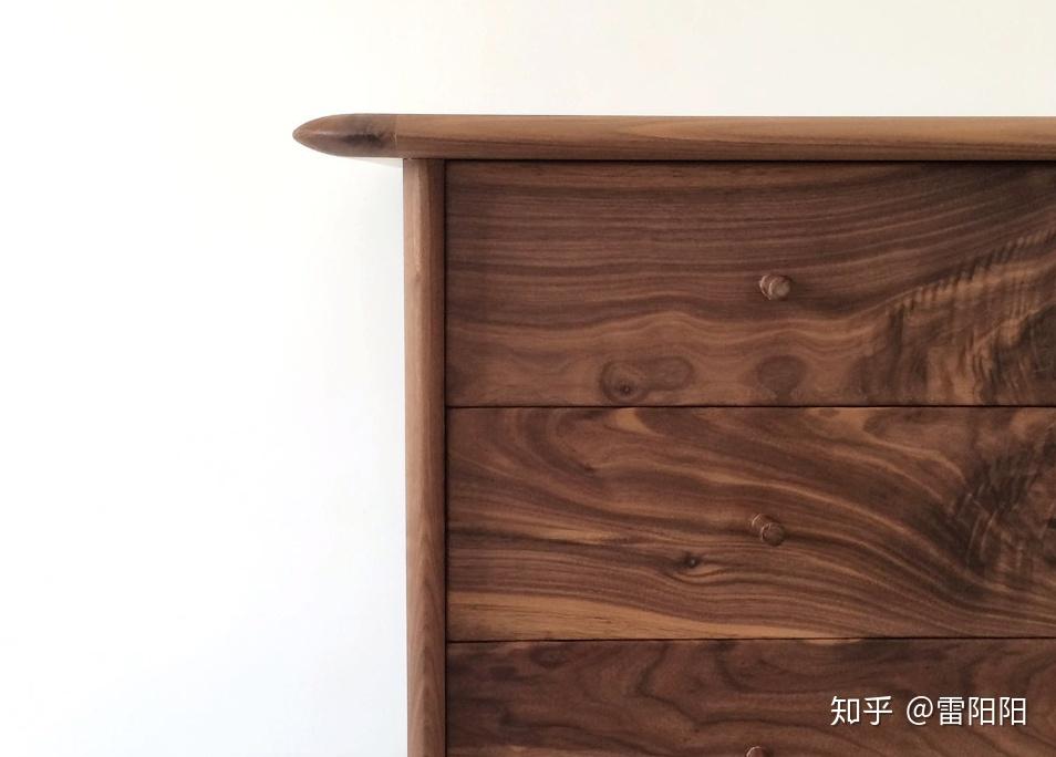 目前很多销量比较大的品牌是主材黑胡桃(外部)+辅材实木多层板(抽屉板与背板)的形式,这是降低成本与售后维护的方式,一是贴皮实木多层板本身价格便宜,二是制作上避免了选板/拼板/砂板/打磨等多道工序,三是多层板的稳定性高,降低了售后维修的几率。