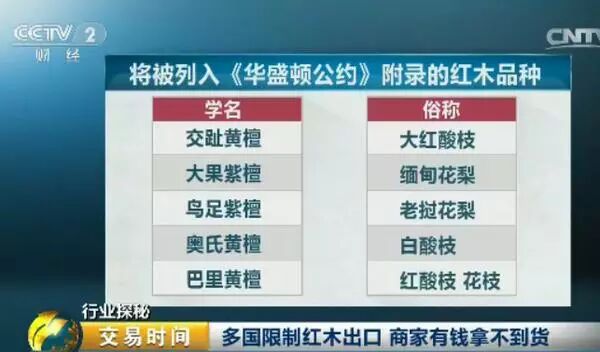 在此之前,已有巴西黑黄檀被列入附录一,檀香紫檀、交趾黄檀、中美洲黄檀、微凹黄檀等被列入附录二,伯利兹黄檀和卢氏黑黄檀(俗称大叶紫檀)等被列入附录三。今年9月份华盛顿公约缔约国大会,将提交新的红木管制议案,将交趾黄檀(大红酸枝)的管制范围由原木、锯材扩大到家具及零部件,新增大果紫檀(缅甸花梨)、鸟足紫檀(老挝花梨)、奥氏黄檀(白酸枝)和巴里黄檀(红酸枝、花枝)列入附录二。