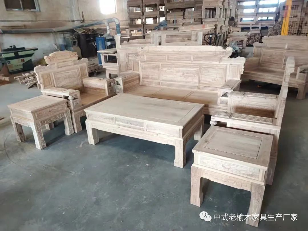 北榆木家具:木纹理粗矿大方,质地坚硬,榆树广泛分布于我国北方地区;一般北榆木家具的质量要南榆木的家具更好。一般透雕浮雕均能适应,刨面光滑,弦面花纹美丽,是主要家具用材之一。传统榫卯结构工艺,明榫与暗榫相结合,体现了家具的“韵”多名几十年工作经验的雕刻师傅同时作业,家具保质保量。