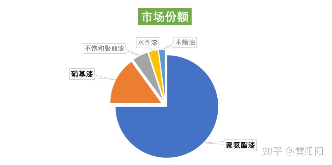 根据成膜物质的不同,油漆分为聚氨酯漆(PU)、硝基漆(NC)、不饱和聚酯漆(PE)以及酸固化氨基漆(AC)。在国内市场,大约75%左右的家具使用聚氨酯漆,15%左右使用硝基漆,剩下10%左右是不饱和聚酯漆、水性漆以及木蜡油等等。