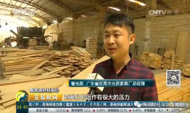 广东省东莞市大岭山光跃家具厂总经理 曾光跃:近期原材料上涨,对我们的运作有很大的压力,比较焦虑。比如说就木材来讲,以前是2900元一方,现在到3300元,甚至更多。以前我们价格可能维持半年甚至一年都不会有价格的变动,而近期供应商经常会发传真、发微信告诉我们木材不断波动和增长。