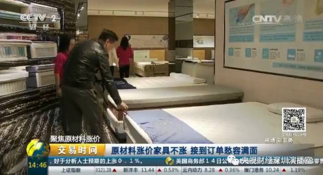 深圳市中深爱的寝具科技有限公司董事长 张凯生:就以床垫的剖样为例,这里面的总共的层面分为几大类,这里有布料的化纤,这个涨幅已经超过15%,海绵类涨幅最高峰去到70%;像钢材,这是弹簧,钢材类涨幅在55%左右。所以说,整个床垫的涨幅平均下来涨幅应该在20%-30%左右。