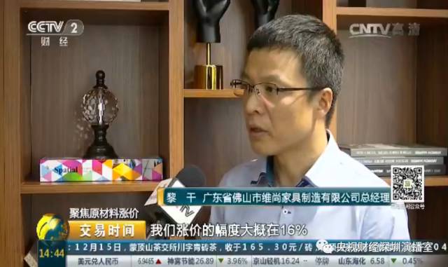 广东省佛山市维尚家具制造有限公司总经理 黎干:我们讲长期价也好,友情价也好,我们涨价的幅度大概在16%,我相信其他企业肯定不止这个价格,至少是20%。