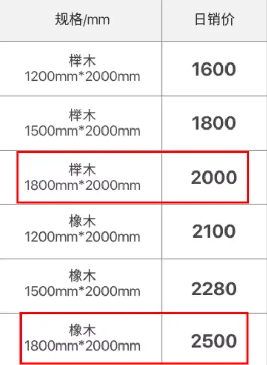 1.8米的榉木床定价2000元,而同尺寸的橡木床则定价2500元。(非真正入手价格,具体价格看活动力度)