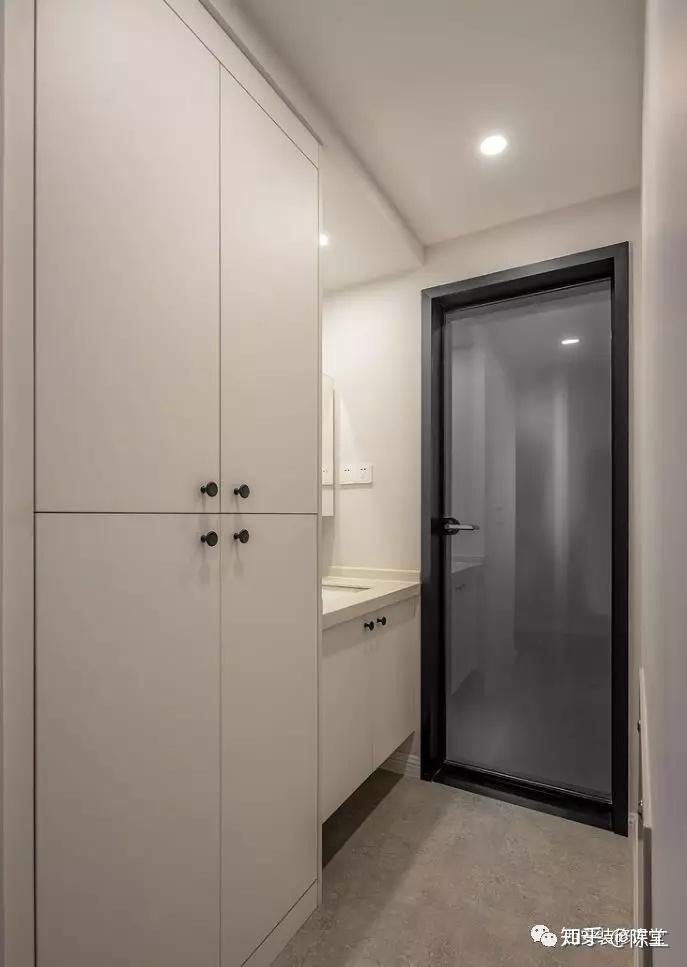 ▲进门过道窄就可以利用一部分卧室墙体来实现满足功能,白色百叶门,黑色把手,视觉上也能干净亮堂。镂空是为了满足基本的进门顺手放置鞋子和杂物。同时利用空间布置全身镜以及换鞋凳,需要根据个人需求和空间是否允许布置《镶嵌式鞋柜好看,砌墙或者砸墙就可以