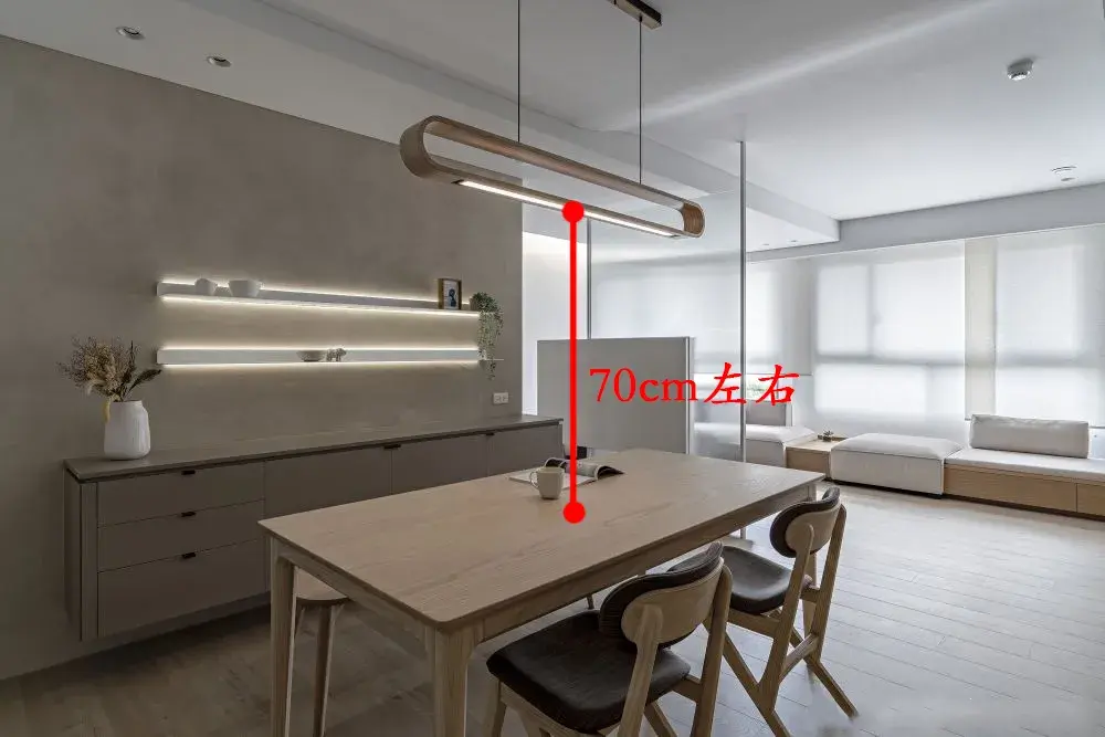如餐桌上方使用吊灯,一般建议吊灯与餐桌的距离约为70 cm,若层高不同,需自行调整。