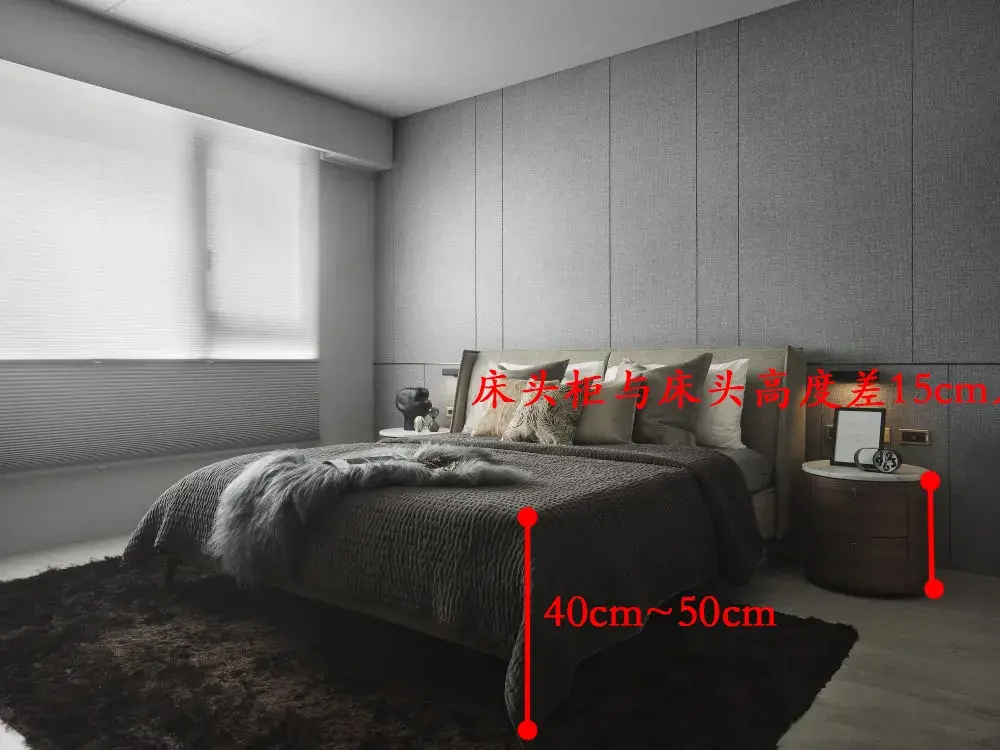 床的高度=人的身高×2/5床头柜一般和床高(加上床垫的高度)差不多,15 cm以上或15 cm以下即可。