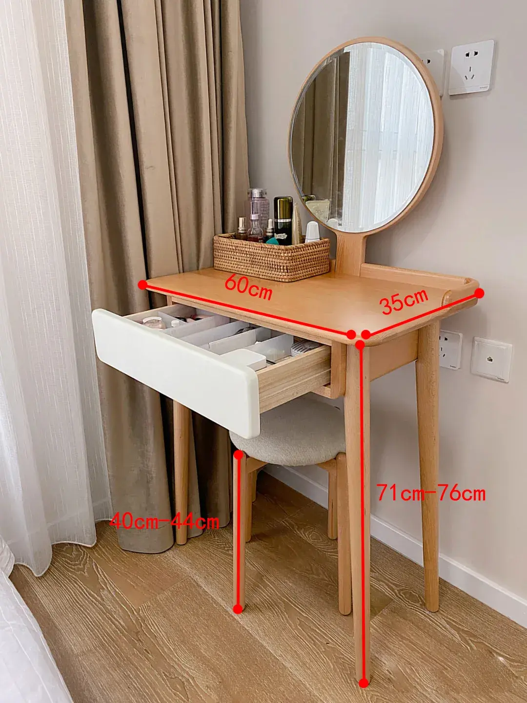 梳妆台的尺寸深度在40~61cm(拉开凳子时),一个人通行宽度在52cm左右,则与床之间的通道宽度应为106~116cm。